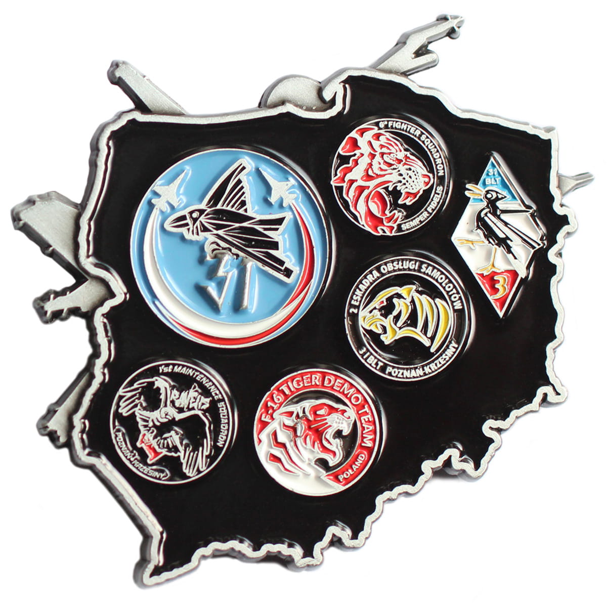 Na coinie znajdują się m.in. godła 6. Eskadry Lotniczej ("6 Fighter Squadron Fidelis Semper"), 2. Eskadry Obsługi Samolotów oraz zespołu demonstracyjnego F-16 Tiger Demo Team Poland.
