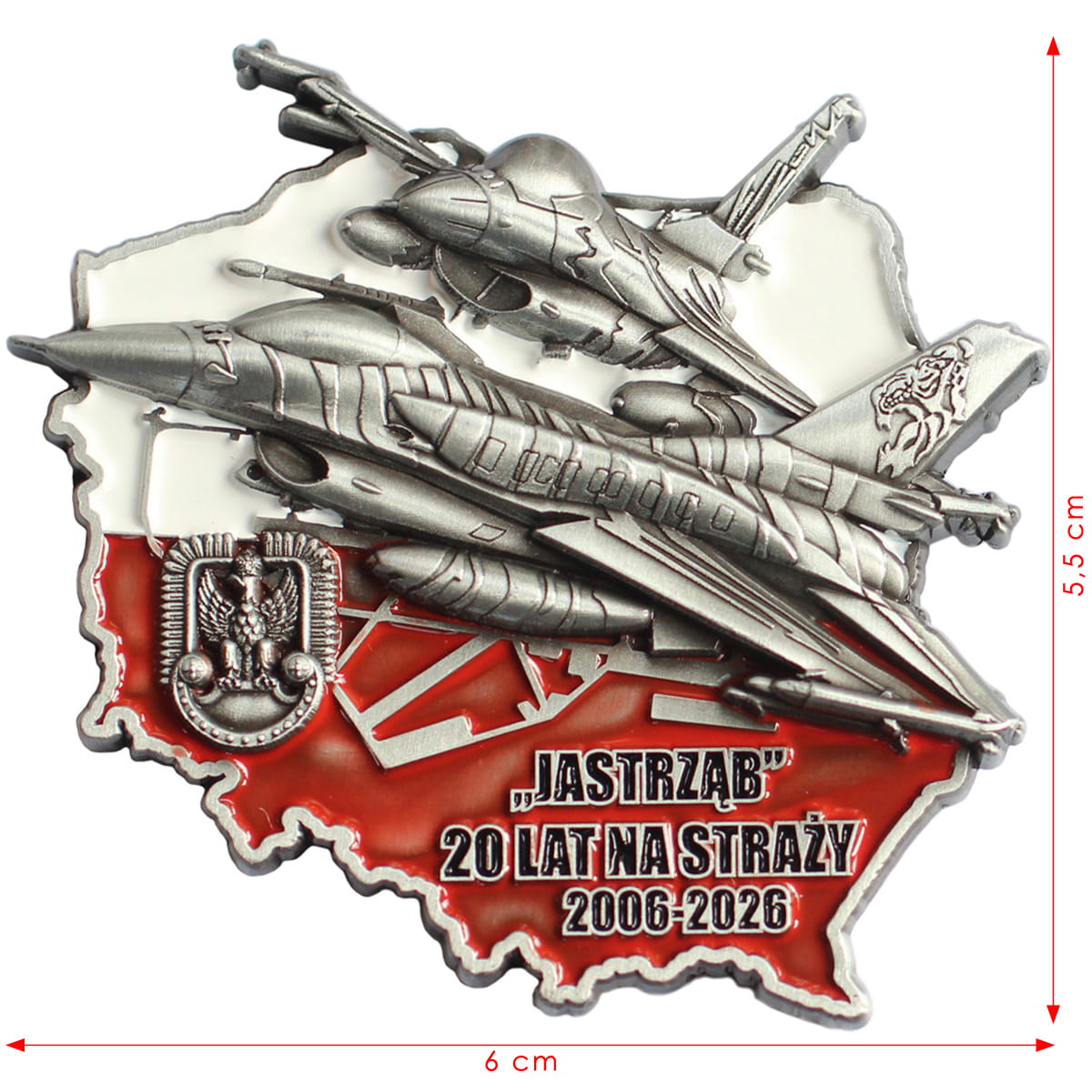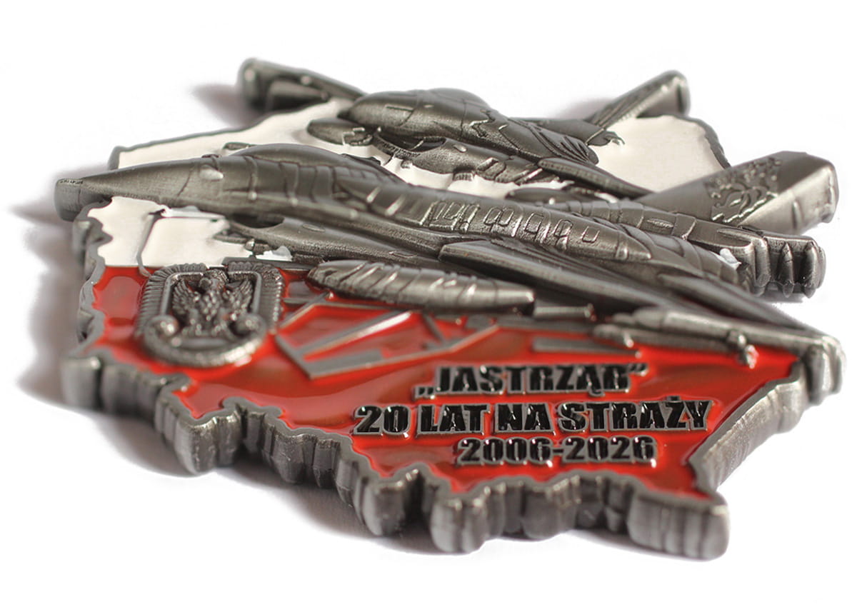 Coin ma kształt konturu Polski w barwach narodowych, z wizerunkiem godła wojskowego i dwoma reliefowymi myśliwcami F-16. Samoloty te, nazywane w Polsce Jastrzębiami, zrewolucjonizowały polskie lotnictwo i wprowadziły Siły Powietrzne do natowskiej ekstraklasy.